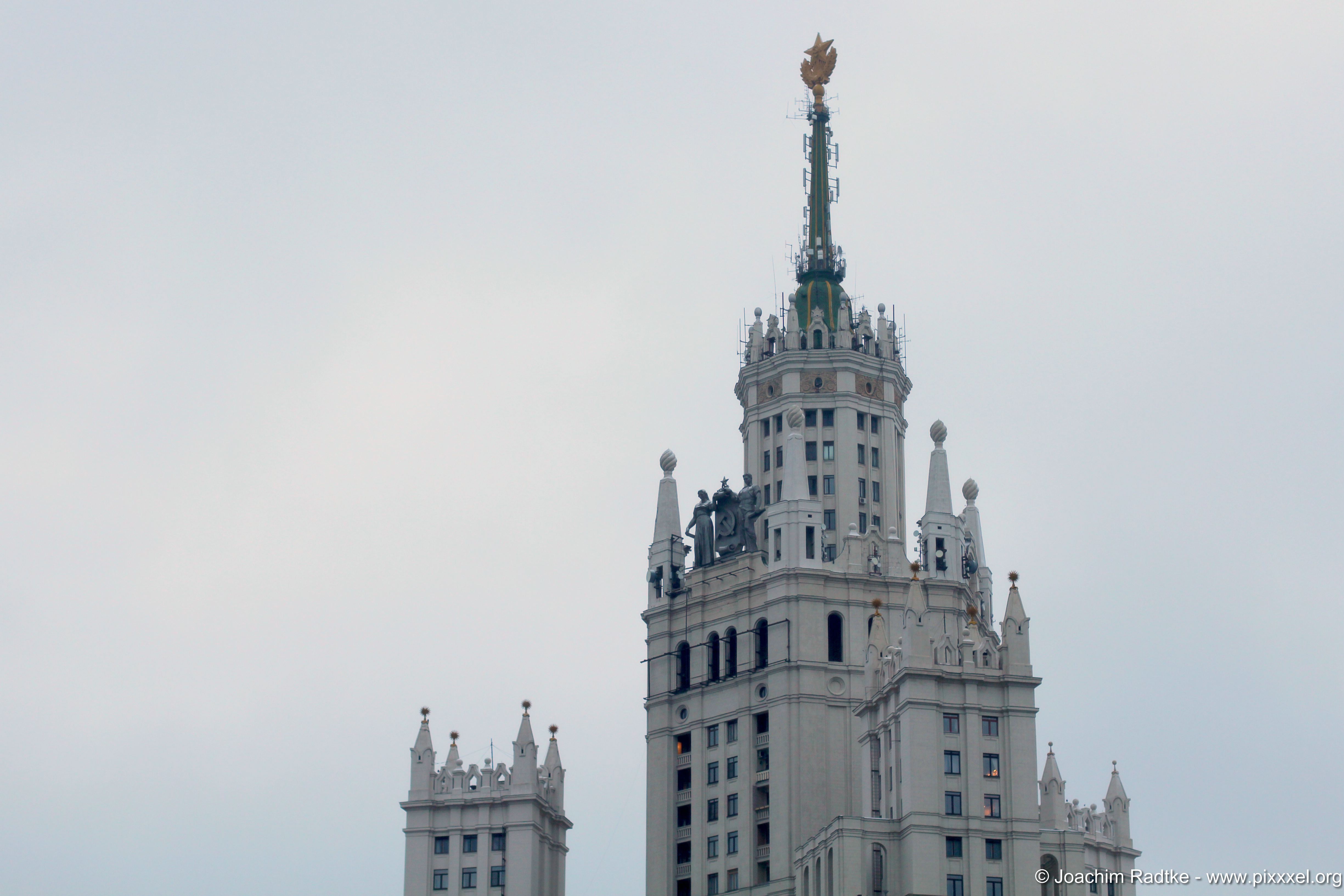 Der Stahlskelettbau zählt 26 Stockwerke (32 zusammen mit den technischen Stockwerken) und hat eine Höhe von 176 Meter. In diesem Teil des Komplexes befinden sich 540 Wohnungen, davon 336 Zweizimmer-, 173 Dreizimmer-, 18 Vierzimmer- und 13 Einzimmerwohnungen. Ergänzt wird er um einen Komplex von 9-stöckigen Seitenflügeln, die annähernd sternförmig um den Hauptteil herum angeordnet sind, wobei sich zwei vordere Seitenflügel genau parallel den Flussläufen der Jausa und der Moskwa erstrecken. Eine Besonderheit dieses Gebäudes ist, dass einer der Seitenflügel bereits vor dem Beginn des Zweiten Weltkriegs – nämlich 1938–1940 – von denselben Architekten erbaut und erst ein Jahrzehnt später in den Gesamtkomplex integriert wurde.