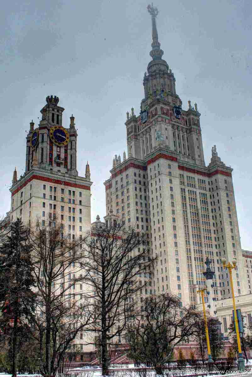 Der zentrale Campus der Lomonossow-Universität wurde 1948–1953 auf den Sperlingsbergen, etwas abseits des Stadtzentrums errichtet, und besteht aus dem zentralen Turm mit ausgedehnten Seitenanbauten. Entworfen wurde der Komplex von Lew Rudnew und drei weiteren Architekten. Mit 235 Metern und 36 Stockwerken ist der zentrale Turm des Gebäudes das höchste Bauwerk unter den Sieben Schwestern. Heute sind dort die Fakultäten für Geologie, Geografie und die mechanisch-mathematische Fakultät untergebracht. Die um den zentralen Turm herum symmetrisch angeordneten Seitenflügel beherbergen nicht nur Universitätsräume, sondern auch Studentenwohnheime und Wohnungen für das Lehrpersonal.