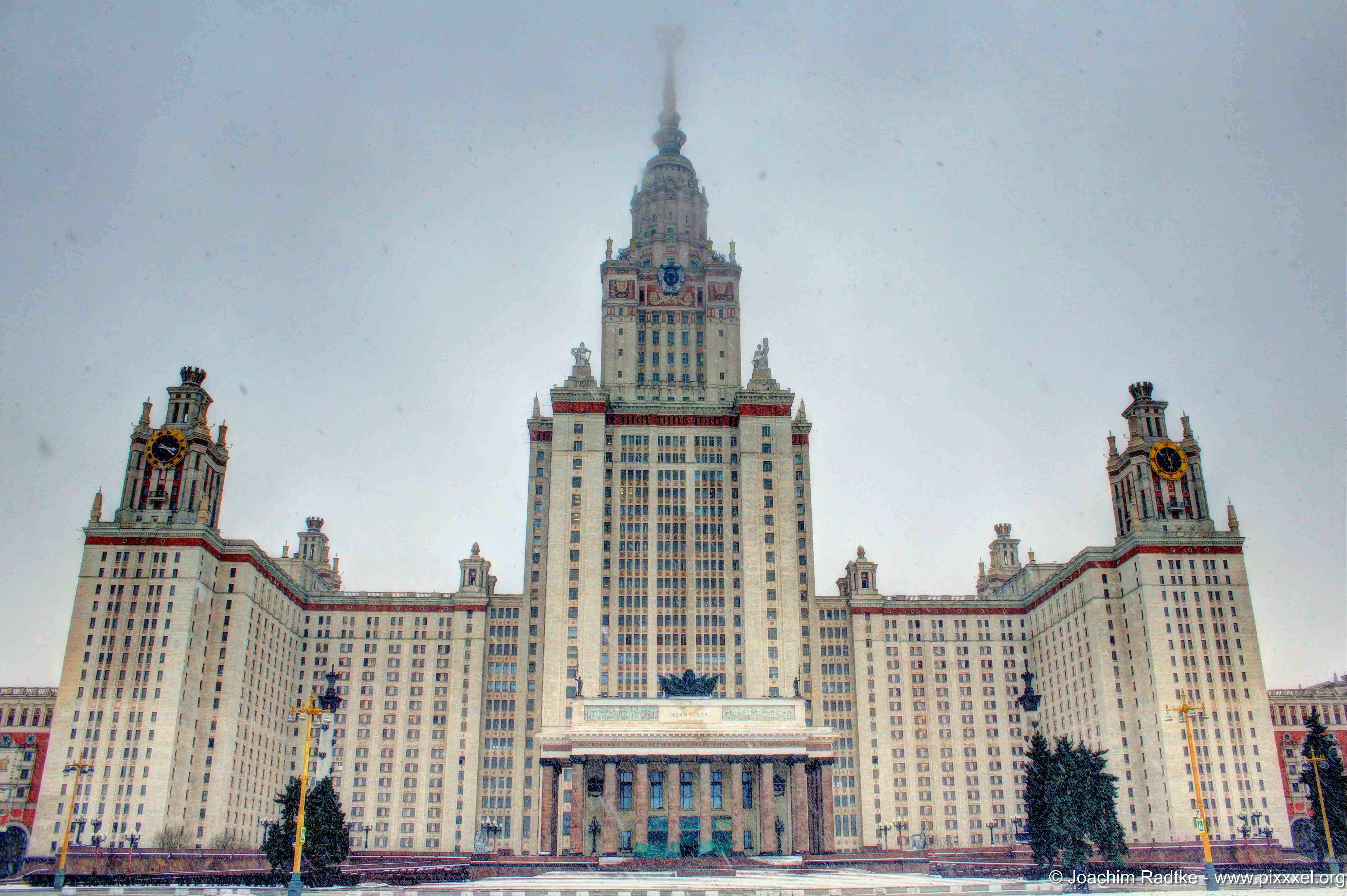 Der zentrale Campus der Lomonossow-Universität wurde 1948–1953 auf den Sperlingsbergen, etwas abseits des Stadtzentrums errichtet, und besteht aus dem zentralen Turm mit ausgedehnten Seitenanbauten. Entworfen wurde der Komplex von Lew Rudnew und drei weiteren Architekten. Mit 235 Metern und 36 Stockwerken ist der zentrale Turm des Gebäudes das höchste Bauwerk unter den Sieben Schwestern. Heute sind dort die Fakultäten für Geologie, Geografie und die mechanisch-mathematische Fakultät untergebracht. Die um den zentralen Turm herum symmetrisch angeordneten Seitenflügel beherbergen nicht nur Universitätsräume, sondern auch Studentenwohnheime und Wohnungen für das Lehrpersonal.